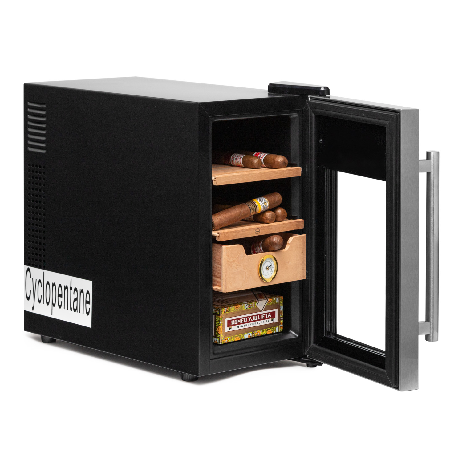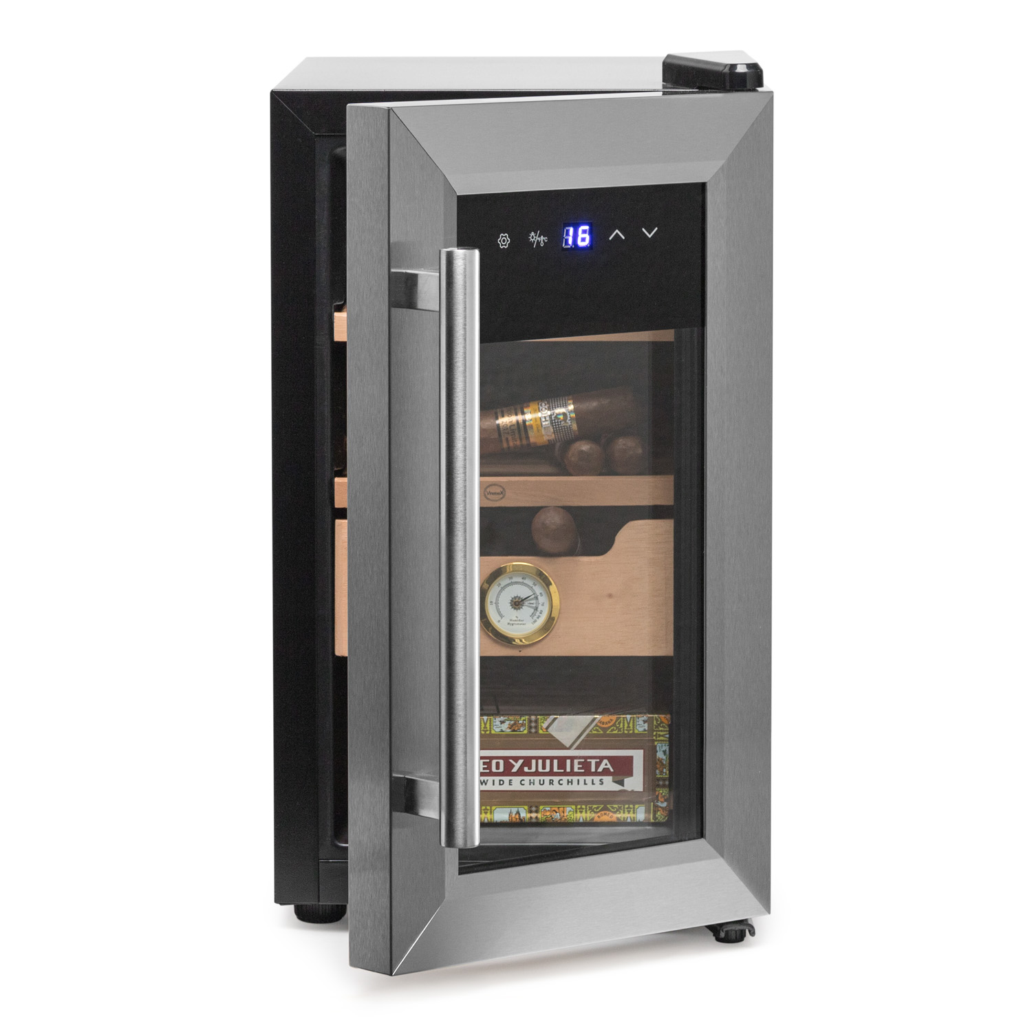 La tecnología, dimensiones y estética hacen de la Cigarbox el armario perfecto para tus puros. Cuenta con un sistema de frío termoeléctrico, dos baldas correderas de madera y un cajón. Es el regalo de moda para toda ocasión.
